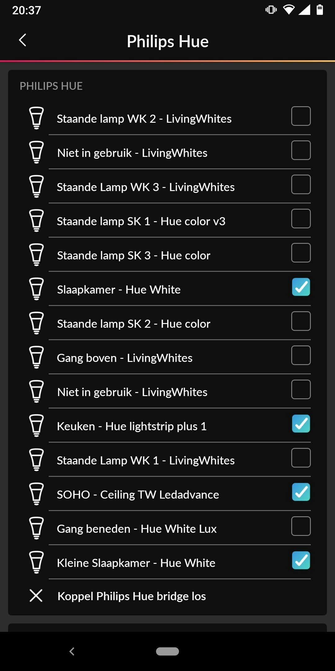 In de HomeWizard-app koppel je de Hue Bridge waarna je zelf kunt besluiten welke van je Hue-lampen daadwerkelijk in de HomeWizard-app getoond worden. Handig, want het heeft wat mij betreft geen zin om al mijn lampen te ontsluiten. Voor mij is het voldoende om alleen de lampen te zien die ik via HomeWizard daadwerkelijk aan een fysieke lichtschakelaar wil koppelen. Vind je een automatiseringsfunctie in de app toch handig of wil je de lampen koppelen met Smartwares-producten, dan kun je natuurlijk wel alle Hue-lampen toevoegen.
