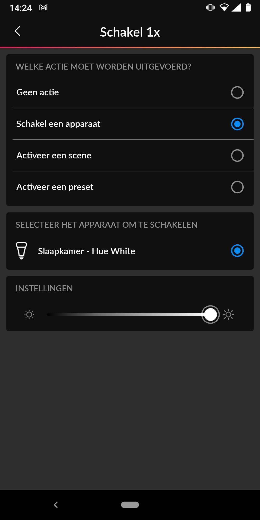 De koppeling tussen een lamp en een schakelaar is eenvoudig te maken en je kunt acties toekennen aan 1, 2 3 en 4 keer schakelen. Ik heb aan de 1x schakelen de actie schakel apparaat toegekend. Dat betekent dat als je op de normale manier je lichtschakelaar gebruikt, de status van de lamp verandert. Staat de lamp aan, dan gaat ie uit. En staat de lamp uit, dan gaat ie aan. Je kunt dus probleemloos de Hue-app of een andere schakelaar gebruiken, de schakelaar met daarachter de Wall switch converter doet altijd wat je ervan verwacht. Je kunt via de app instellen met welke tint of kleur en helderheid een lamp ingeschakeld moet worden via de schakelaar. Zolang je één lamp tegelijkertijd wilt in- of uitschakelen, werkt het geheel prima.