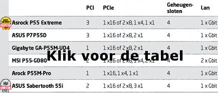Alle beschikbare LGA1156-borden zijn gebaseerd op dezelfde P55-chipset van Intel. Alternatieven zijn er niet. NVIDIA heeft geen licentie voor LGA1156 en AMD zal sowieso geen chipsets voor Intel-processors willen ontwikkelen. De LGA1156-processors beschikken zowel over een ingebouwde geheugencontroller als een PCIe-controller voor de videokaart. In vergelijking met andere chipsets heeft de P55 dus minder functionaliteit aan boord. De P55 bestaat uit slechts één chip in plaats van de gebruikelijke twee (‘northbridge’ en ‘southbridge’). Bovendien is hij energiezuinig: van alle typische chipsetcomponenten gebruiken de geheugen- en PCIe-controllers de meeste energie. De P55 biedt veertien usb-poorten en acht PCIe x1-lanes voor extra uitbreidingskaarten. Ingebouwde video ontbreekt - geen van de geteste modellen is hiermee uitgerust.