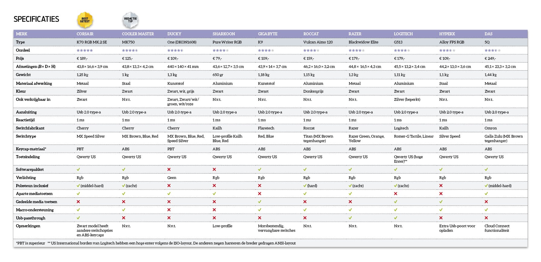 Ben je niet merkgebonden? Dan zien we wel wat echte uitblinkers. De grote uitdaging is dan vooral te bedenken wat nu echt aan jouw eisen voldoet, want de uitstralingen en extra mogelijkheden lopen wel sterk uiteen. Denk vooral aan zaken zoals een polssteun, verlichting of fysieke mediatoetsen, waar je lastig afscheid van neemt als je er eenmaal aan gewend bent. Maar zelfs zonder merkvoorkeuren zal een iets luxer model voor iets meer geld altijd blijven lonken: de betaalbare Sharkoon PureWriter is toegankelijk en biedt veel voor die prijs, maar Ducky is niet veel duurder terwijl je daar kwalitatief wel weer een sprong vooruit maakt. Maar dan komt de qua mogelijkheden veel rijkere Cooler Master MK750, die we bekronen met een redactietip ook meteen om de hoek kijken. En vanaf dat prijspunt lonkt de top alweer, bijvoorbeeld de wat duurdere Corsair K70 RGB MK.2 met een nog wat chiquere afwerking en betere kwaliteit keycaps, die we belonen met een Best getest. Kortom: pas op dat je met twee keer knipperen niet spontaan op dubbel je originele budget uitkomt.