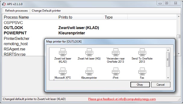 Heb je meerdere fysieke printers, dan moet je er natuurlijk telkens zelf op letten naar welke printer je afdrukt. Dankzij de wat oudere, gratis tool Automatic Print Switcher kun je die keuze deels automatiseren. Na het opstarten van de tool hoef je maar de naam van het proces aan te klikken (zoals Outlook of Powerpnt), waarna je vanuit het contextmenu de gewenste printer aanduidt. Voortaan zal dat proces (en dus de bijhorende toepassing) standaard naar de geselecteerde printer afdrukken.