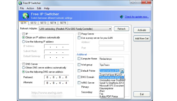 Een andere situatie: je gebruikt je laptop zowel thuis als op het werk. In plaats van telkens zelf de juiste printer te moeten selecteren, laat je dat aan Free IP Switcher over. Het komt erop neer dat je voor beide locaties aangepaste netwerkprofielen creëert, met aparte instellingen voor het IP-adres, dns-server, gateway én de standaardprinter. Daarna hoef je maar het gewenste profiel te selecteren en op Activate te drukken om naar het juiste profiel, inclusief printer, om te schakelen. Wat printers betreft, zit deze functionaliteit in laptops al ingebouwd in Windows 7 en hoger. Open hier Apparaten en printers, selecteer de gewenste printer en klik bovenaan op Standaardprinters beheren, waarna je printer en netwerk aan elkaar koppelt.