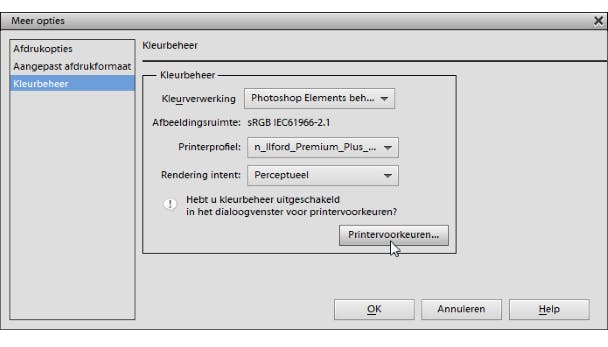 Voor optimale afdrukresultaten van je foto's gebruik je geschikt fotopapier. Niet zelden blijkt papier van de printerproducent daarvoor het best geschikt en blijven de kleuren ook langer behouden (zie ook de tests). Sommige producenten leveren bovendien ICC/ICM-printerprofielen mee die zijn aangepast aan het gekozen papiertype. Stel, je gebruikt papier van Ilford. Surf dan naar www.ilford.com en klik op Request Printer Profiles. Meld je aan, maak de juiste keuzes (bijvoorbeeld inkjet photo paper / Epson / Stylus Photo 1500W / Premium Plus Glossy Paper 270gsm), download het bijhorende zip-bestand en pak het uit. Klik het ICC-bestand met de rechtermuisknop aan en kies Profiel installeren (of plaats het bestand zelf in de map C:\Windows\System32\spool\drivers\color). Start je favoriete beeldbewerkingsprogramma op en geef aan dat je dat printprofiel wilt gebruiken. In het meegeleverde pdf-document van Ilford lees je hier meer over. In Photoshop Elements 12 bijvoorbeeld gaat dat als volgt: kies Bestand / Afdrukken / Meer opties / Kleurbeheer en kies bij het item Kleurverwerking de optie Photoshop Elements beheert kleuren. Kies het juiste printerprofiel en stel het item Rendering intent in op de optie Perceptueel. Vervolgens schakel je het kleurbeheer van uw printer(driver) uit of geef je aan dat je dat aan de gebruikte applicatie overlaat. Ook deze procedure staat in het pdf-document beschreven, voor diverse printermerken.