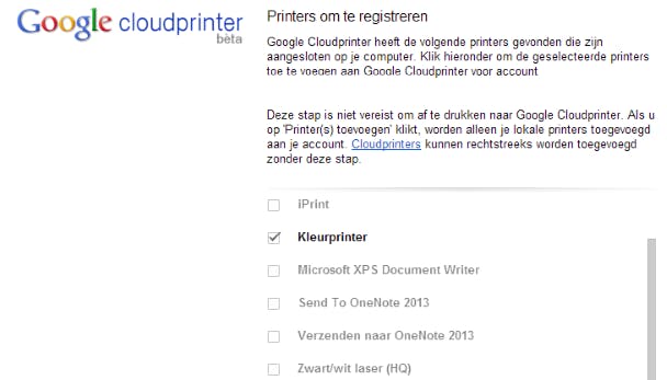 In een notendop pak je dat als volgt aan. Start Google Chrome op en klik op Google Chrome aanpassen en beheren / Instellingen / Geavanceerde instellingen weergeven. Ga naar de rubriek Google Cloudprinter en klik op de knoppen Beheren / Printers toevoegen. Plaats een vinkje bij de printers die je langs deze weg bereikbaar wilt maken en bevestig met Printer(s) toevoegen. Met een snelle blik op deze webpagina controleer je dat de toevoeging is gelukt en daarna kun je aan de slag. Op een willekeurige desktop-pc start je dan Google Chrome op en meld je je aan met je Google-account. Wanneer je nu een webpagina afdrukt, kun je met de knop Wijzigen naar de rubriek Google Cloudprinter gaan en via Alles weergeven de gewenste printer selecteren.