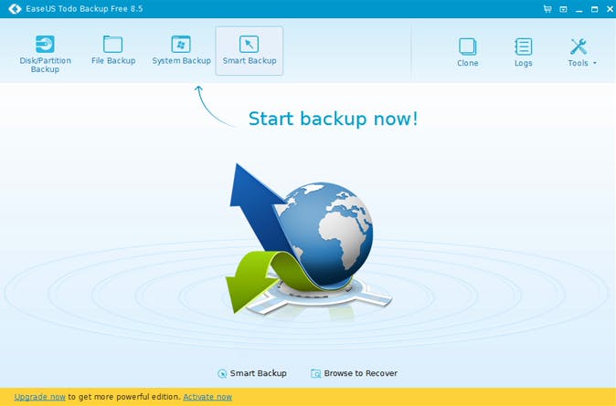 Om het programma te kunnen downloaden, moet je eerst je e-mailadres invullen. Dit hoeft niet noodzakelijk je echte (hoofd)adres te zijn. De installatie is eenvoudig. Verwijder in het vijfde venster eventueel het vinkje bij Join in the Customer Experience Improvement Program en rond de installatie af. Bij de opstart van het programma klik je op Later om aan te geven dat je (op dit moment) niet geïnteresseerd bent in een betaalde licentie. Je belandt nu automatisch in het hoofdvenster van Todo Backup, waar je meteen wordt aangespoord een back-up te maken. Er staan maar liefst vier back-uptypes voor je klaar: Disk/Partition Backup, File Backup, System Backup en Smart Backup - de Clone-optie niet meegerekend. Gezien wij in eerste instantie onze gegevensbestanden willen back-uppen, zijn er in dit stadium twee opties interessant: File Backup en Smart Backup.