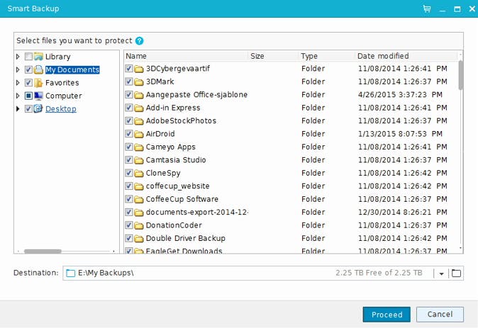 Lijkt zo'n volautomatisch scenario je wel iets, klik dan Smart Backup aan en geen aan welke bestanden je mee wilt nemen in zo'n back-up. Standaard staan je documentenmap, je favorieten en je bureaublad geselecteerd, maar je kunt dit dus naar wens aanpassen door vinkjes te plaatsen of te verwijderen. Via het mapicoontje verwijs je vervolgens naar de gewenste doellocatie: die verschijnt dan achter Destination. Nog even op Proceed klikken en je 'slimme back-up' is ingepland.