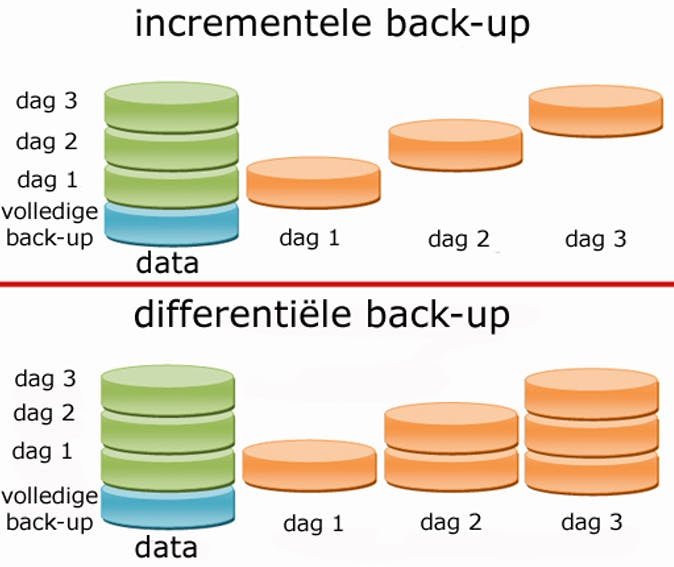 Een differentiële back-up gaat telkens uit van de laatste volledige back-up.