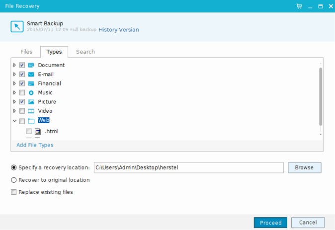 Het blijft nog altijd mogelijk alleen specifieke bestanden terug te halen. Daarvoor gebruik je de knop Recovery. Todo Backup leest vervolgens het image-bestand in, zodat jij de inhoud net als in de verkenner door kunt bladeren. Klik op History Version om naar de gewenste back-upversie te gaan en selecteer alle nodige mappen of bestanden. Via het tabblad Types kun je je selectie ook beperken tot specifieke bestandstypes en met Add File Types kun je zelf nog andere bestandsextensies toevoegen, zoals *.htm. Geef aan naar welke locatie je de bestanden wilt terugzetten en of bestanden (met dezelfde naam) overschreven mogen worden. Bevestig met Proceed.