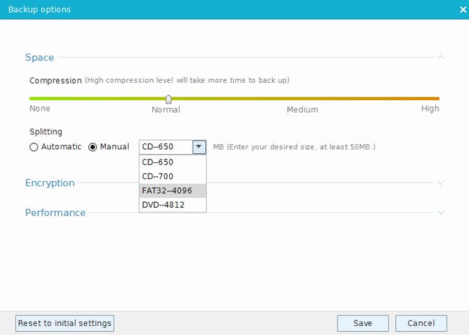Er zijn overigens nog wel meer instellingsmogelijkheden voor je back-up. Die bereik je via Backup options. In de rubriek Space leg je de compressiefactor voor het image vast (van None over Normal en Medium tot High) en geef je tevens aan of je het image vanaf een bepaalde grootte automatisch wilt laten opsplitsen. Dat kan bijvoorbeeld nuttig zijn wanneer je de images op een FAT32-medium wilt bewaren, aangezien de maximale bestandsgrootte daarbij 4096 MB is. In de rubriek Encryption kun je je images afschermen met een sterk wachtwoord. Met de schuifknoppen in de rubriek Performance maak je duidelijk hoeveel systeembronnen of hoeveel netwerkbandbreedte het back-upproces mag gebruiken. Bevestig ook hier je keuzes met Save.