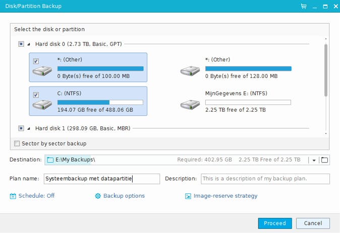 Je zult meteen merken dat het scherm van zo'n schijf- of partitieback-up veel overeenkomsten vertoont met dat van een bestandsback-up. Alleen moet je hier geen mappen of bestanden selecteren maar complete schijven of individuele partities. De overige opties, zoals Schedule, Image-reserve strategy en Backup options, zijn nagenoeg hetzelfde gebleven.
