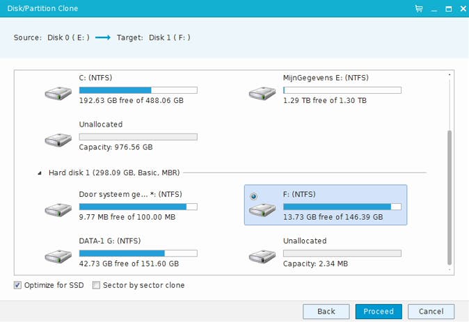 Zoals we al eerder kort aangaven, kan Todo Backup ook een rechtstreekse schijf- of partitiekopie maken, dus naar een tweede aangesloten schijf. Daarvoor klop je aan bij Clone, waar je in eerste instantie de gewenste bronschijf of -partitie aanduidt. Druk op de knop Next en geef te kennen naar welke doelschijf of -partitie je die wilt kopiëren. Hier vind je weer de optie Sector by sector clone terug (vergelijkbaar met tip 8) maar tref je ook een nieuwe optie aan: Optimize for SSD. Als je doellocatie een SSD of een zogenoemde AF-schijf (advanced format) is, zorg dan dat je deze optie aanstipt, zodat de partitie correct wordt uitgelijnd. Bij twijfel plaats je hier bij voorkeur toch een vinkje. Houd er wel rekening mee dat alle bestaande gegevens op de doellocatie overschreven zullen worden. Zet de operatie in gang met de knop Proceed.