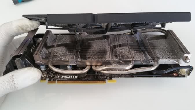Onze grafische kaart zit met vier schroefjes vast. Helaas kunnen we hem niet helemaal verwijderen, omdat de kabel van de stroomaansluiting vastzit tussen de koelribben. Als de fan is gedemonteerd, kun je met een kwastje en perslucht de koelribben voorzichtig schoonmaken. Als alles stofvrij is, schroef je alles weer op het koelelement en plaats je de kaart terug in het slot. Vergeet niet alle kabels weer aan te sluiten.