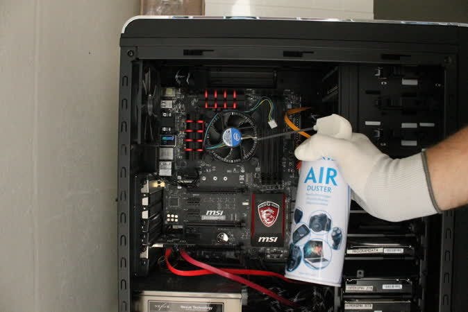 Perslucht is de gemakkelijkste wijze om de pc schoon te houden. Blaas met regelmaat de onderdelen schoon, zodat stof geen kans krijgt zich op te hopen. Het is een klusje dat het best in de buitenlucht kan worden uitgevoerd. Als de ventilator te snel draait gaat deze stuk. Houd daarom tijdens het schoonblazen de fan met je vinger tegen of steek er tijdelijk een stokje tussen. Houd de bus persluchtreiniger recht en blaas met korte stoten van een kleine afstand het stof weg. Herhaal dit ook bij de koelribben onder de fan en de koeling van de grafische kaart. Neem ook direct overige onderdelen mee zoals de voeding, voorkant en achterkant van de behuizing. In luxe systeemkasten zitten vaak filters die het stof tegenhouden, dit is het moment deze schoon te kloppen.