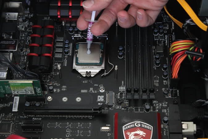 Koelpasta kun je bij vrijwel elke computerzaak kopen. Het wordt meestal in een spuitvormige tube geleverd, zodat je de pasta eruit kunt drukken. Spuit een heel klein drupje op de het midden van de processor. Een klein druppeltje is ruim voldoende om de minuscule kieren tussen de processor en de koeler op te vullen. Koelpasta zelf is geen koelmiddel en het koelt niet beter als je er een dikke laag op smeert. Strijk de koelpasta egaal over de cpu uit met bijvoorbeeld een oud (bank)pasje. Als het gehele oppervlak is bedekt, plaats je de koeler terug. Draai de vier drukpennetjes van de koeler in de juiste positie (met de klok mee) en boven de vier gaten die om de processor zitten. Druk voorzichtig de pennetjes schuin tegenover elkaar in de gaten en doe dit daarna ook bij de andere twee. Vergeet niet de fan weer aan te sluiten op het moederbord.