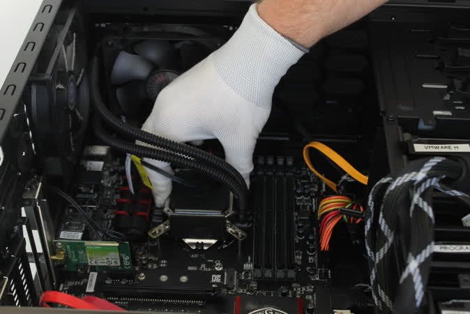 In de regel past de waterkoeling achter in de systeemkast op de plek waar de 120mm-fan zit. Als je de waterkoeling bovenin het systeem kwijt kunt, is dat een betere oplossing, omdat de warmte daar beter weg kan. Breng vervolgens een beetje koelpasta aan op de cpu en verspreid het egaal over het oppervlak. Over het koelblok komt ook een klem die door de vier bouten wordt aangetrokken. Plaats het koelblok met de klem op de cpu en draai het eerste moertje vast op de bout. Draai daarna het moertje er schuin tegenover vast en vervolgens de andere twee. Draai alles voorzichtig aan met een schroevendraaier en sluit de stroomstekkers van de fan en het koelblok aan op het moederbord.