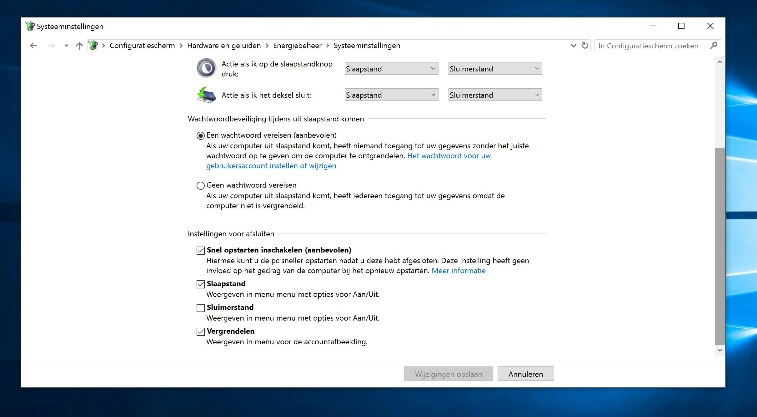 Je vindt deze optie hier: 'Configuratiescherm' -> 'Hardware en geluiden' -> 'Energiebeheer'. Kies daar in het linkerpaneel 'Het gedrag van de aan/uit-knoppen bepalen'