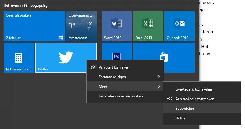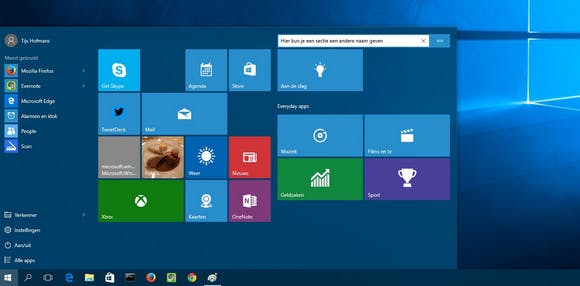 Het startmenu, dat in Windows 10 eindelijk weer is teruggekeerd, biedt verschillende mogelijkheden om te personaliseren. Misschien heb je helemaal geen zin in een volgepropt startmenu, of wil je met een schone lei beginnen. In dat geval druk met de rechtermuisknopp op een app en druk je op Van Start losmaken. Op diezelfde manier kun je de app wel laten staan, maar de live-functie ervan uitschakelen, zodat je niet meer op bijvoorbeeld agenda-items of weersvoorspellingen geattendeerd wordt, maar wel snel naar de betreffende app kan gaan. Dat doe je door de functie Live-tegel uitschakelen te gebruiken. Via rechtermuisknop > Formaat wijzigen kun je de tegens groter, kleiner, breder of smaller maken, voor zover de app zelf dat toelaat.