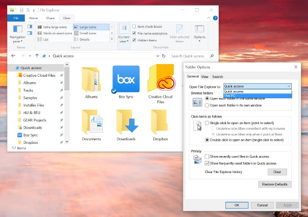 Snellle toegang is in Windows 10 de standaardweergave binnen de verkenner. Het laat de laatst gebruikte mappen en bestanden zien, zodat je die snel weer kunt openen. Dat is op zich handig, maar als je de oude structuur van Windows 8 gewend bent, kun je gelukkig nog terug. Open een nieuw venster in de Verkenner en ga naar Beeld > Opties. Ga naar het tabblad Algemeen, als je daar niet al uitkomt, en selecteerd in het menu Verkenner openen in de optie Deze PC. Als je nu de verkenner opent, krijg je gewoon weer de map Deze PC te zien, zoals dat ook in oudere Windows-versies het geval was.