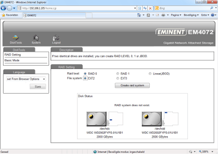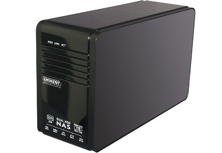 Over het algemeen is stilstand achteruitgang en dat geldt ook voor de Eminent EM4072 (tevens Gigashare Nas Pro Duo genoemd). We hebben deze al eens in 2009 getest en sindsdien is er niets aan het product veranderd. Volgens Eminent is dat omdat er nog voldoende vraag naar de NAS is, maar je kunt je afvragen hoe valide dat argument is wanneer de EM4072 de enige NAS in de test is waarin beide schijven nog met data- en powerkabels moeten worden aangesloten. De beschikbare ruimte in de behuizing is bovendien erg klein en de installatie is dus verre van handig en zeer foutgevoelig. Aanvankelijk werd van de twee 2TB-schijven er maar één herkend, maar via het internet biedt Eminent een firmware-update aan die 'problemen met grote schijven' verhelpt. Daarna waren er wel twee schijven zichtbaar en daarmee de mogelijkheid RAID te configureren. De webinterface van de EM4072 beperkt zich tot het noodzakelijke en ontbeert iedere franje. Configureren is daarmee eenvoudig, er zijn maar vijf plekken waar een functie verstopt kan zitten. Het is mogelijk de functionaliteit van de NAS met packages uit te breiden. Eminent levert behalve de Syabas UPnP Mediaserver vooral downloadsoftware: MLDonkey, NZB en Transmission (torrents). De traagheid waarmee de packages worden uitgepakt en geïnstalleerd, is tekenend voor het gebrek aan rekenkracht en geheugencapaciteit dat deze NAS parten begint te spelen. Na de installatie werkt de mediaserver wel, de torrentdownloader niet. Uitleg over hoe een en ander zou moeten werken, is dankzij de gebruikers van het forum van Eminent, online te vinden.