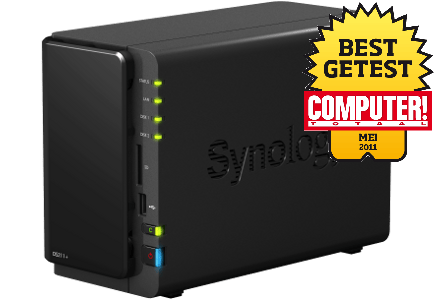 De DS211+ is het topmodel in een serie van drie nieuwe tweedisk NAS-apparaten van Synology. Evenals Netgear biedt ook Synology een eigen flexibele RAID-versie. Dit SHR kiest afhankelijk van het aantal schijven automatisch voor gegevensbeveiliging en fouttolerantie, maar kan daarbij later gemakkelijker de schijfgrootte aanpassen. De webinterface van de Synology is uniek. Het is niet zozeer een webinterface, maar een volledig besturingssysteem waarbinnen de gebruiker een eigen bureaublad heeft en daar ook snelkoppelingen naar programma's of mappen op kan plaatsen. Packages heeft Synology nog altijd minder dan QNAP en anderen. Packages van derden zijn er wel, maar van wisselende kwaliteit. Een veelbelovende officiële uitbreiding is TimeBackup waarmee de NAS back-ups kan maken van bestanden op de NAS mits deze op verschillende volumes staan. Het gebrek aan officiële packages speelt de Synology minder parten door het enorme aanbod aan functies voor zowel zakelijk als privégebruik. Zo is iSCSI standaard aanwezig, is er de mogelijkheid beelden van bewakingscamera's te bewaren, heeft het een ftp-server en een downloadfunctie, en is er de mogelijkheid muziek direct vanaf de NAS af te spelen of foto's te presenteren. Net als Buffalo en QNAP biedt Synology apps voor iPad, iPhone iPod touch en Android-tablets en smartphones waarmee foto's, video's en muziek kunnen worden gestreamd en geüpload. Als een van de weinige NAS-apparaten is de QNAP uitgerust met een kaartlezer voor SD-kaarten.