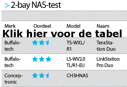 Het aanbod aan NAS-apparaten met twee schijven is erg groot. Van een salontafelmodel zoals de Looqs, naar echt zakelijke modellen zoals de Netgear en vooral de Iomega. De laatste start misschien wel een nieuwe trend waarbij de NAS nadrukkelijker gekoppeld wordt aan online diensten. Ook QNAP heeft hierin eerste stappen gezet. Binnen het aanbod aan NAS-apparaten is een duidelijk tweedeling te zien wanneer naar de prijs wordt gekeken. Synology, QNAP en Thecus vragen de hoofdprijs, maar leveren ook de beste apparaten. Uiteindelijk vinden we de NAS van Synology met zijn uitgebreide interface het fijnste apparaat en we belonen het dan ook met het keurmerk Best Getest. De duurste NAS in de test is echter Netgear, die weliswaar goed scoort maar toch minder gebruiksvriendelijk is dan de genoemde andere merken en meer moet doen om privégebruikers tevreden te stellen. Wie minder geld wil uitgeven, kan kiezen voor de Conceptronic of Eminent, maar doet met de Fantec dan de beste keuze.