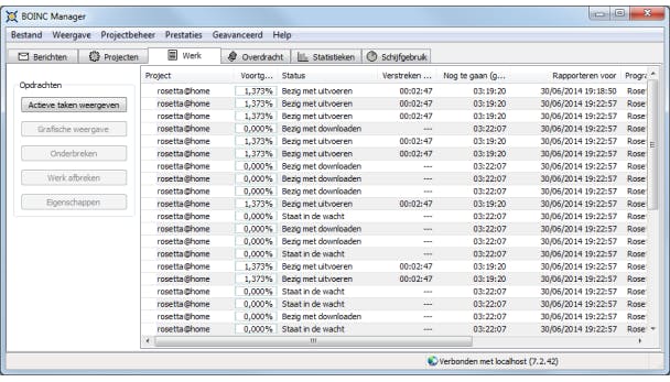 Keer je terug naar de BOINC Manager dan merk je dat je project intussen is toegevoegd en dat 'werk wordt gedownload', een proces dat even kan duren. Je kunt op elk moment de activiteiten tijdelijk stopzetten via de knop Onderbreken en weer in gang zetten met Hervatten. Een project definitief weghalen kan ook: kies Project specifieke instructies en druk op Verwijderen. Gedetailleerde informatie over een lopend project vind je via het menu Weergave / Geavanceerd.