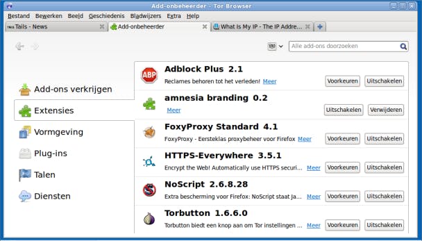 Herstart nu je computer vanaf de stick en bevestig de vraag Persistentie gebruiken, zodat data opgeslagen kunnen worden. Om veilig te surfen selecteer je daarna Toepassingen / Internet / Iceweasel webbrowser. Je zult merken dat je - met dank aan het Tor-netwerk - niet langer via je eigen IP-adres surft: een bezoek aan een site als www.whatismyip.com zal dat bevestigen. Iceweasel is bovendien met enkele extensies uitgerust die nog bijkomende waarborgen voor je privacy bieden, waaronder HTTPS-Everywhere, die waar mogelijk automatisch voor een versleutelde https-connectie zorgt. Verder tref je hier ook nog Adblock Plus, FoxyProxy en NoScript aan. Al deze extensies beheer je via Extra / Add-ons / Extensies.