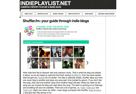 De Spotify-afspeellijst Indieplaylist stelt u in staat maandelijks kennis te maken met gloednieuwe muziek die kan variëren van obscure singer/songswriters tot hippe electro. De lijst biedt een alternatief voor het grote aanbod aan mainstreammuziek, aldus de samensteller. De muziekbibliotheek van Spotify is immers veel groter dan dat. De lijst wordt op elke eerste van de maand automatisch ververst. De Indieplaylist, die met 600 subscribers bijzonder populair is, heeft ook een eigen website met meer informatie en uitleg over de lijst. De site is te vinden via Indieplaylist en is ook te volgen op Twitter via @INDIE_playlist.