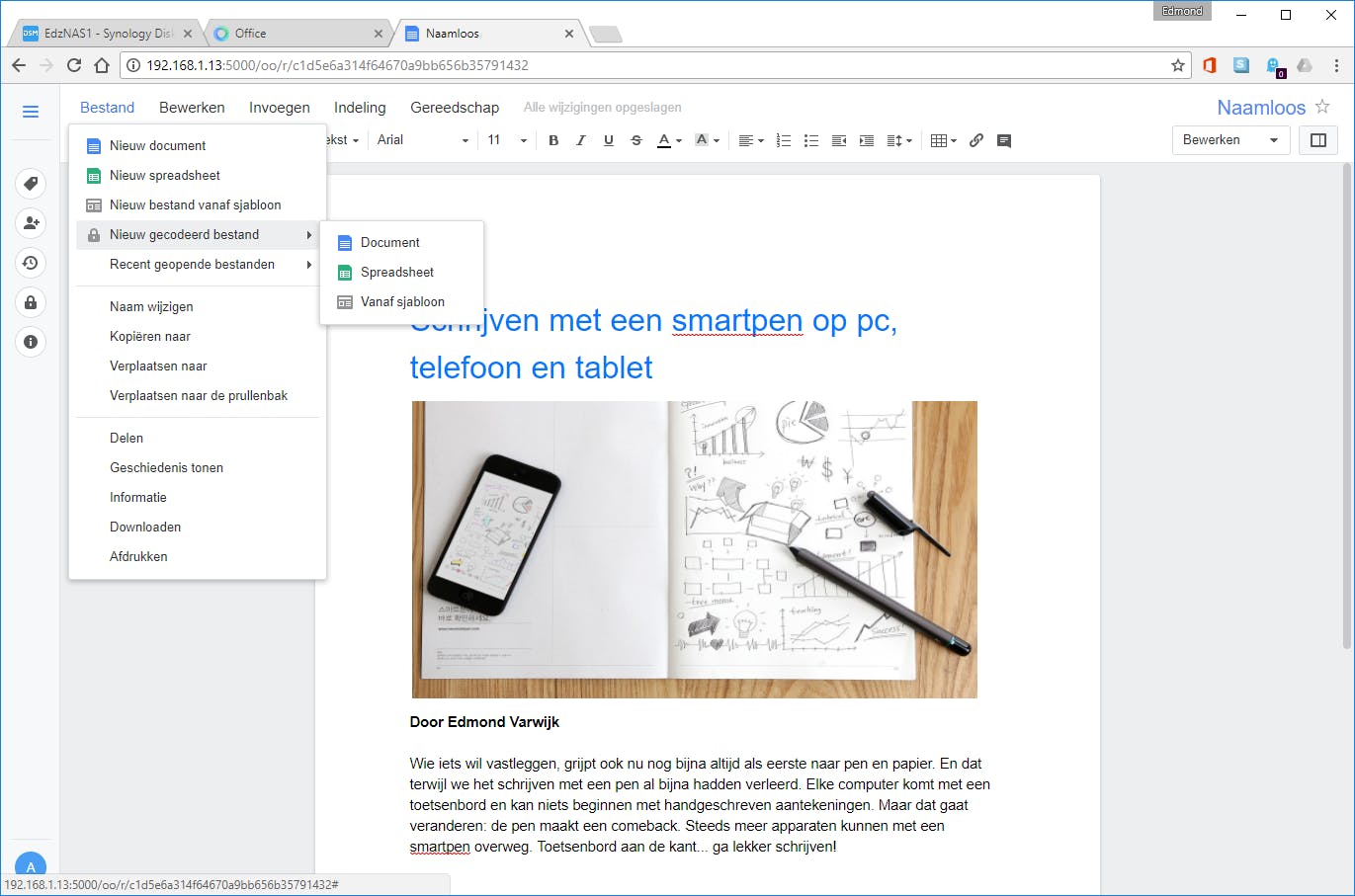 Aangezien je documenten toch al op je nas staan, is het niet handig om ze daat direct op te kunnen bewerken? Verschillende nas-fabrikanten, Synology voorop, zijn bezig eigen Office-pakketten voor de nas te maken. Denk aan alternatieven voor Word, Excel en PowerPoint, maar ook contactbeheer, e-mail etc. Al deze applicaties gebruik je in de browser of via één van de apps voor tablet en smartphone. Synology heeft Synology Office, MailPlus, PDF Viewer en Calendar. QNAP biedt Notes QContactz en QmailAgent, maar nog geen echte Office-programma’s. Die gaan ongetwijfeld komen (de grote merken kijken namelijk veel bij elkaar af).
