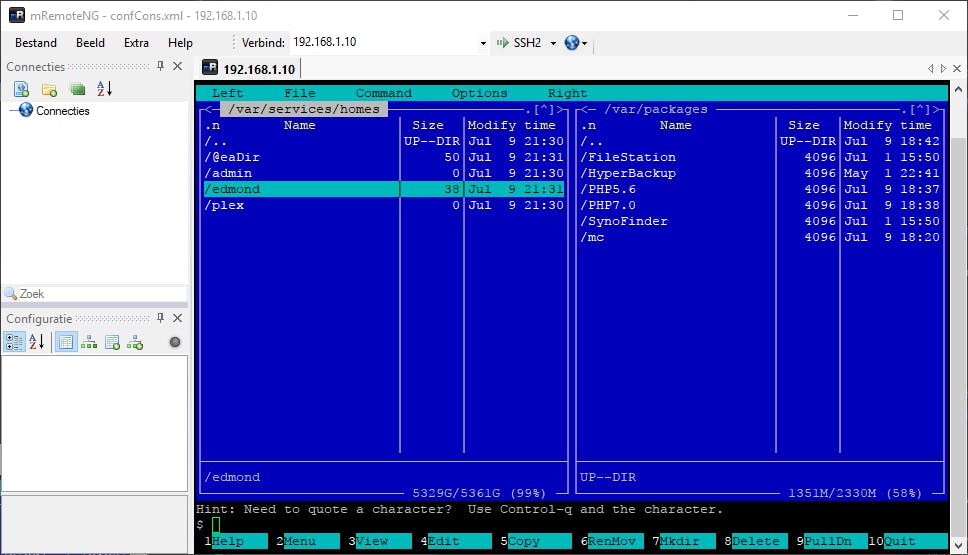 Elke nas heeft wel een verkenner om bestanden op de nas te beheren, mappen te maken en bestanden te kopiëren. Heel gebruiksvriendelijk zijn die Windows Verkenner-klonen niet en binnen de browser zijn de mogelijkheden ook nog eens beperkt. Je moet het resultaat van elke actie afwachten en veel van wat op bestandsniveau belangrijk is, is onzichtbaar. Een oud tooltje (maar zeker niet versleten) is de Midnight Commander: een Norton Commander-kloon voor gebruik op de nas. Je installeert het vanuit één van de alternatieve community’s. Schakel daarna ssh-toegang in en log in via ssh om Midnight Commander te starten.