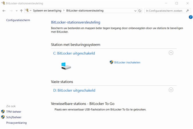 Als je veel onderweg bent en je laptop ergens mee naartoe neemt, wil je goed voorbereid zijn op het ergste. Als deze bijvoorbeeld gestolen wordt, wil je niet dat de dief toegang heeft tot je persoonlijke bestanden en wachtwoorden. Daarom is het een goed idee om je laptop te versleutelen. Een pc met een professionele versie van Windows kan gebruikmaken van BitLocker, waarna de hele computer is versleuteld. Om dat in te schakelen, ga je naar het Configuratiescherm / Systeem en beveiliging / BitLocker-stationsversleuteling. Vervolgens klik je bij je C-schijf op BitLocker inschakelen en volg je de stappen. Het kan zijn dat Windows een foutmelding geeft over een ontbrekende TPM-chip. Je opent dan het menu Start, typt Groepsbeleid en drukt op Enter. Ga nu naar Computerconfiguratie / Beheerssjablonen / Windows-onderdelen / BitLocker-stationsversleuteling / Systeemstations en kies de optie Extra authenticatie vereisen bij opstarten. Zet deze op Ingeschakeld en zorg dat de optie BitLocker zonder een compatible TPM toestaan is ingeschakeld. Klik op OK.
