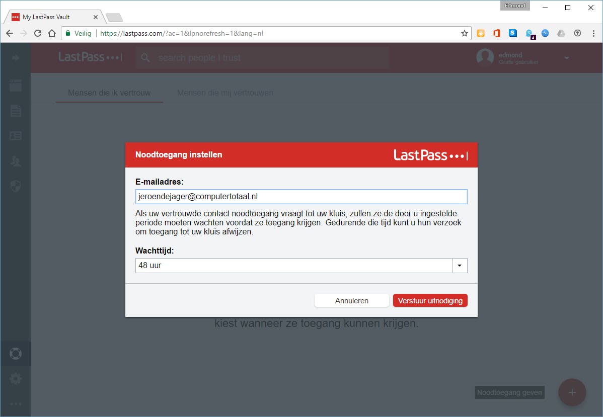 LastPass is een online wachtwoordmanager. Op de pc gebruik je de browser om je wachtwoorden te gebruiken. LastPass integreert met alle bekende browsers en vult dan de inloggegevens automatisch voor je in als je een site bezoekt. Doordat de wachtwoordkluis in de cloud staat, is deze altijd toegankelijk. Er zijn ook mobiele apps. LastPass biedt enkele leuke extra’s. Zo kan het de kwaliteit van jouw wachtwoorden beoordelen en kun je log-ins tijdelijk delen. Voor noodgevallen kun je anderen (tijdelijk) toegang verlenen tot je kluis.