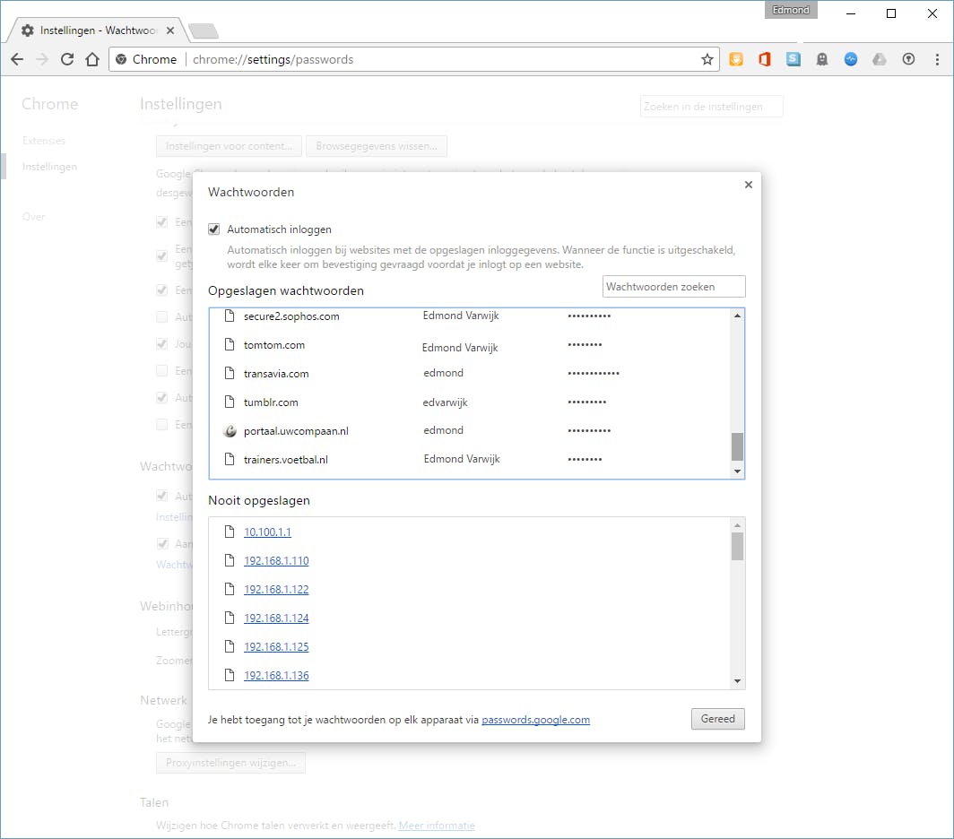 Steeds meer browsers bieden een wachtwoordmanager, zoals ook Chrome. Log je in op een website, dan vraagt Chrome je of het inloggegevens voor je zal bewaren. Ben je ingelogd in Chrome, dan synchroniseer je de wachtwoorden tussen al je Chrome-apparaten, zoals je smartphone. De opgeslagen wachtwoorden beheren doe je via Chrome / Instellingen / Geavanceerde instellingen weergeven / Wachtwoorden beheren of online.