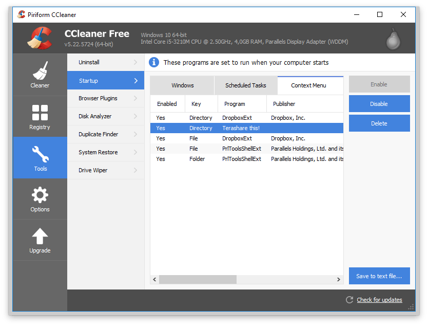 CCleaner is een zeer uitgebreid programma waarmee je allerlei verschillende taken kunt uitvoeren. Ook op het gebied van bestandsbeheer heeft het gereedschap interessante opties. Sommige programma´s laten opties achter in het rechtermuisknopmenu. Met CCleaner blokkeer je deze items tijdelijk of verwijder je ze permanent door naar Startup / Context Menu te navigeren. Ook kun je het programma laten checken of er extra vrije schijfruimte gegenereerd kan worden door bepaalde tijdelijke bestanden te verwijderen. CCleaner heeft ook een heleboel zoekopties om dubbele bestanden te vinden en van je schijf te halen.