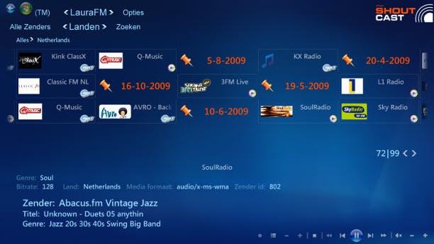 Windows Media Center is voornamelijk bedoeld voor het afspelen van video en het kijken van televisie. Toch kan een mediacenter ook prima dienstdoen als radio, met als nadeel dat u natuurlijk wel de televisie moet aanzetten. Met behulp van mcShoutCast voegt u duizenden internetradiostations toe aan Windows Media Center. Download op de website mcShouCast.com de juiste versie (32 of 64 bit). Na installatie vindt u mcShoutCast terug onder Muziek / radio / mcShoutCast. Nederlandse zenders vindt u onder LauraFM door te kiezen voor Landen en dan Nederland te zoeken.