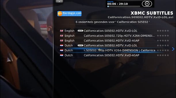 Het is met XBMC mogelijk om ondertitels automatisch toe te voegen, voor het geval ze niet met het videobestand werden meegeleverd. Klik in het hoofdmenu op Systeem en vervolgens op Skin / Add-on Snelkoppelingen en klik op Ondertiteling Add-on. Klik op de knop Add-ons installeren en kies hier XBMC Subtitles en klik op Installeren. Wanneer u nu een video zonder ondertiteling afspeelt en u op het knopje voor ondertitels klikt, dan krijgt u een lijst met gevonden ondertitelingen. Ga in deze lijst naar rechts voor Addon settings om meer services en talen te activeren. De service Bierdopje.com heeft bijvoorbeeld veel Nederlandse ondertitelingen.