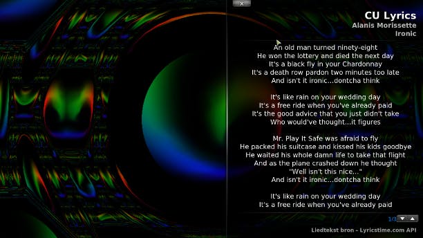 Tijdens het afspelen van een liedje kunt u XBMC de liedteksten laten weergeven. Hiervoor moet u wel een add-on installeren. Klik in het hoofdmenu op Systeem en kies Skin. Klik op Add-on Snelkoppelingen en klik op Liedtekst Add-on. Kies Add-ons installeren en kies voor CU Lyrics waarna u op Installeren klikt. Speel een liedje af en klik op de cursortoets naar links zodat de optie Volledig scherm verschijnt. Klik hierop en klik op het knopje dat eruitziet als een tekstballonnetje. De ondertiteling komt nu in beeld.