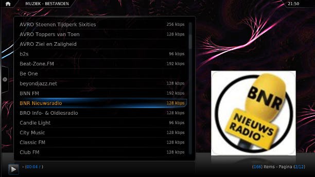 U kunt in XBMC diverse internetradiostations toevoegen. Ga hiervoor in het hoofdmenu naar Muziek en klik op Add-ons / Add-ons installeren en klik in de lijst de dienst aan die u wilt gebruiken. Klik vervolgens op Installeren. Wanneer u nu in het hoofdmenu op Muziek klikt, dan ziet u de dienst die u hebt toegevoegd. Nederlandse stations vindt u in de plug-in Radio. Er is een Grooveshark-plug-in die helaas alleen werkt met een betaald account.