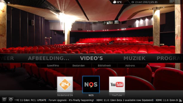 U voegt eenvoudig online televisiekanalen toe aan XBMC. Ga in het hoofdmenu naar Video's en kies Add-ons. Klik op Add-ons installeren en blader vervolgens door de diverse televisiekanalen. Aanraders van Nederlandse bodem zijn Nederland 24 en NOS. Wanneer u een interessant kanaal hebt gevonden, klikt u op de naam en kiest u Installeren. U vindt de geïnstalleerde kanalen terug in XBMC door op Video's te klikken.