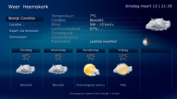 Ongemerkt bekijken we meerdere keren per dag het weerbericht, dus het is handig als we dat ook op ons mediacenter kunnen doen. De plug-in World Weather voegt op een fraaie manier weerinformatie toe aan MediaPortal. Download de plug-in World Weather en doorloop de installatie. Klik op Start / Alle programma's / Team MediaPortal / MediaPortal / MediaPortal Configuration en klik op Plugins. Selecteer World Weather en klik op In Home. Klik vervolgens op Config en voeg uw huidige locatie toe door uw stadsnaam bij bijvoorbeeld positie 6 in te tikken.