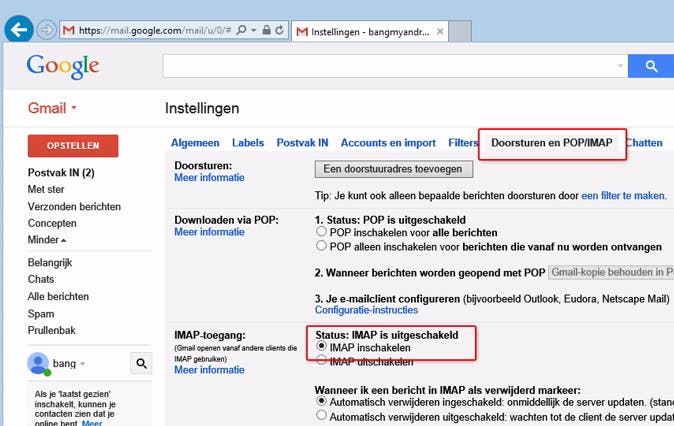 Er is eigenlijk geen reden om Gmail te gebruiken in een andere omgeving dan je webbrowser. De app op je smartphone of tablet-app is uiteraard een uitzondering. Door Gmail te gebruiken in een klassiek mailprogramma op je computer, ontbeer je de functies die Gmail uniek maken. Wie Gmail toch per se met een mailprogramma wil gebruiken, kan kiezen voor IMAP- of POP-toegang. In dit laatste geval heb je alleen de beschikking over je Postvak IN. Met IMAP heb je de beschikking over alle 'mappen' van je Gmail. Labels in Gmail worden als mappen getoond in je mailprogramma. De IMAP-optie kun je kun je inschakelen via Instellingen / Doorsturen en POP IMAP / IMAP-toegang. Klik op Configuratie-instructies om je mailprogramma in te stellen met de juiste gegevens.