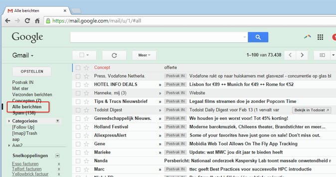 Veel mensen houden van een schoon Postvak IN. Er wordt driftig gewerkt met labels en je bent waarschijnlijk gewend om berichten weg te gooien. Aangezien je veel opslagruimte krijgt bij Google, is dit laatste niet per se nodig. De slimste truc om je Postvak IN leeg te houden, is door er een gewoonte van te maken om berichten te archiveren. De sneltoets hiervoor is E. Berichten die je archiveert belanden in de 'map' Alle berichten. Ook hier hoef je niet in te kijken. Gebruik de krachtige zoekfunctie om een mailtje terug te vinden. Dit gaat veel sneller dan wanneer je zelf zoekt/bladert binnen Alle berichten.