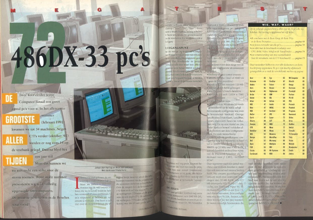 In 1992 zaten we midden in het tijdperk van de pc. Dat tijdperk begon min of meer met de introductie van de Apple II in 1977. Tot de introductie van de IBM-pc in 1981 was de ‘pc-markt’ nog volop in ontwikkeling. In 1992, toen Computer!Totaal begon, was de pc-markt uitgekristalliseerd en zat zeker in een volgende fase: de groeifase. De IBM-compatibele pc had overtuigend gewonnen van andere soorten thuiscomputers. Een IBM-compatibele pc was inmiddels niet alleen iets voor op kantoor, ook thuis werd overwegend een pc gebruikt. Die populariteit van de pc zie je in het eerste nummer van Computer!Totaal uit februari 1992 dan ook duidelijk terug. In een vergelijkende test vergeleken we maar liefst 34 IBM-compatibele pc’s. In een ander artikel vergeleken we slechts vier andere computers: van Apple, Atari, Acorn en Commodore. Kortom: ook thuis hadden we een pc. Een jaar later volgde de grootste megatest ooit: maar liefst 72 pc’s werden met elkaar vergeleken. Iets dat alle pc’s gemeenschappelijk hadden was het uiterlijk: allemaal grijze dozen met grote grijze crt-schermen. Ondanks de snel ontwikkelende techniek zou dat nog lang zo blijven.