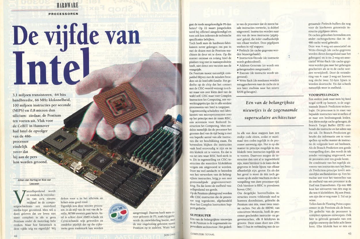 In 1992 zaten in dezelfde test zowel 80286- als 80386-processors en zelfs een enkele 80486-processor. Deze drie generaties in één nummer waren slechts het begin, want processors volgden elkaar in hoog tempo op. Een belangrijke introductie was Intels Pentium in 1993. Voor het eerst had een processor een naam in plaats van slechts een typenummer. Die Pentium bleef ons ook bij omdat de eerste uitvoeringen (60 en 66 MHz) een fout hadden in de floating point unit (fpu) waardoor de uitkomst van sommige delingen niet correct was. Hoewel het om een best theoretisch probleem ging, zorgde de vele media-aandacht ervoor dat Intel een grootscheepse omruilactie op touw zette. Pas in 2007 stapte Intel af van het Pentium-merk voor de topmodellen desktop-processors, en werd overgestapt op Core.