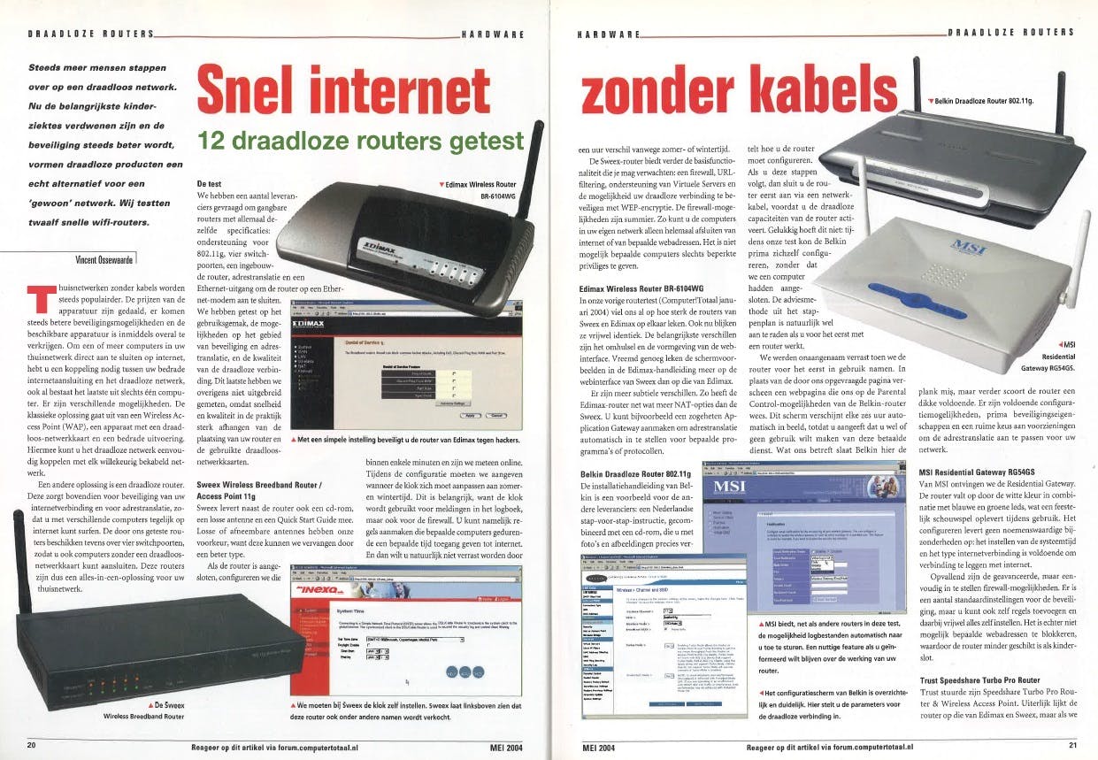 Was in 1993 inbellen al heel wat, tegenwoordig doen we het niet voor minder dan draadloos. Wifi staat bijna synoniem voor internettoegang. Voor zover wij konden achterhalen, stond er pas in 2004 voor het eerste een vergelijkende test van draadloze routers in Computer!Totaal. Volgens ons artikel van toen, zijn met de komst van 802.11g de belangrijkste kinderziektes van wifi verdwenen en vormt een draadloos netwerk een echt alternatief voor een gewoon netwerk. Het is duidelijk: het draadloze tijdperk is ook thuis begonnen. Die routers in 2004 waren 802.11g-routers, oftewel exemplaren die gebruikmaakten van de 2,4GHz-band met een theoretische doorvoersnelheid van 54 Mbit/s. De 802.11g-standaard zal nog lang de heersende standaard blijven, officieel verschijnt opvolger 802.11n pas in 2009. We zien de eerste vergelijkende testen van de 802.11n-draftrouters overigens al in 2007. Deze draft-routers werkten enkel via de 2,4GHz-band. In Computer!Totaal 10/2013 hebben we voor het eerst een vergelijkende test van simultane-dualband-routers, oftewel routers die tegelijkertijd gebruikmaken van de 2,4- en de 5GHz-frequentieband. In 2012 volgde de standaard 802.11ac, waarvan in 2016 de huidige wave 2-varianten verschenen.