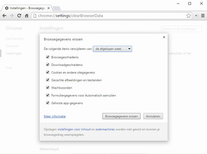 De sneltoets werkt in Chrome, Firefox en Internet Explorer. In Edge (Windows 10) klik je rechtsboven in beeld op de drie stipjes en vervolgens Instellingen / Kies wat u wilt wissen. Safari-gebruikers gaan naar Bewerken / Safari opnieuw instellen.