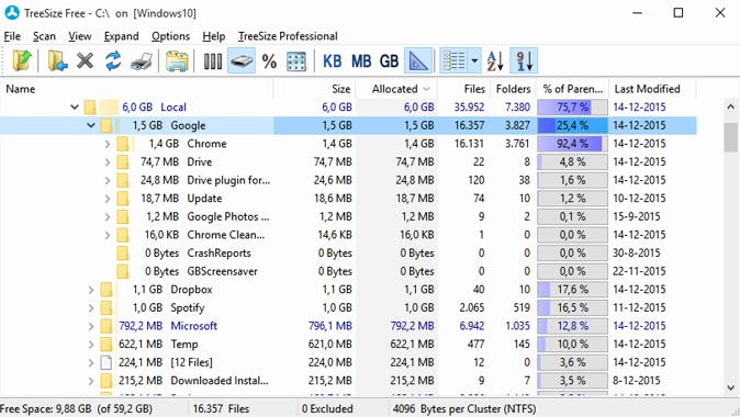 De meeste clouddiensten hebben een flinke beperking als het gaat om opslagcapaciteit, zeker als je een gratis versie gebruikt. Als je Dropbox bijvoorbeeld plotseling vol is, stopt de dienst met synchroniseren totdat de totale bestandsomvang weer binnen de limiet valt. Als je veel mappen hebt, is het lastig om ruimtevreters op te merken. Ook hier helpt TreeSize Free.