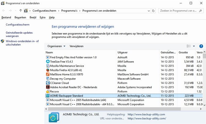 Er zijn meerdere redenen om programma's die je niet meer gebruikt te verwijderen. De voornaamste is uiteraard schijfruimte terugwinnen, maar laten we een potentiele opstartvertraging niet vergeten! Als een programma zichtzelf opstart met Windows, kost dit extra laadtijd. De standaard installatiebeheerder van Windows vind je via Configuratiescherm / Programma's / Programma's en onderdelen. Loop de lijst kritisch door en verwijder alle programma's die je nooit gebruikt. Let op: verwijder geen programma's uit deze lijst waarvan je niet weet waarvoor het dient.