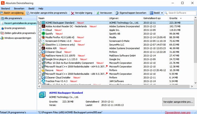 Als je meer dan twee programma's wilt verwijderen, is het al de moeite om Absolute Uninstaller te proberen. Absolute Uninstaller toont een overzicht van je programma's. Sorteer eventueel op 'programma-omvang' via de kolom Grootte of kies Installatiedatum om snel recente (of juist oude) installaties te bekijken. Klik op Batch verwijdering. Alle programma's krijgen nu een selectievakje. Selecteer de programma's die je wilt de-installeren. Klik op Verwijder aangevinkte programma's om de juiste procedure achter elkaar uit te voeren.