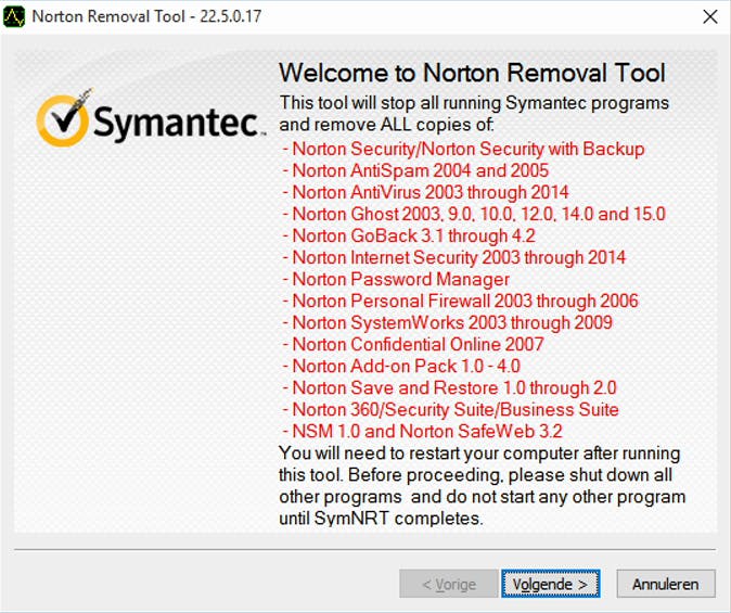 Sommige programma's laten zich niet zomaar verwijderen. Dit komt voor bij beveiligingsprogramma's. Achtergebleven resten voorkomen helaas de correcte werking van een nieuw beveiligingsprogramma met alle gevolgen van dien. Veel softwaremakers bieden een hapklare oplossing voor dit soort problemen en die luistert naar de naam 'removal tool'. Als je bijvoorbeeld zoekt in Google naar 'norton removal tool' kom je bij een programmaatje uit dat alle oude versies van Norton van je computer kan verwijderen. Dit is slechts een voorbeeld, er zijn ook 'removal tools' voor Office-producten, programma's van Adobe, Acronis en vele andere softwarefabrikanten.